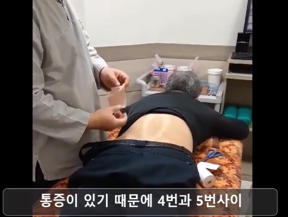 허리 통증에 좋은 자리인 척추 4번5번 자리에 기적의 플라이 패치를 붙입니다.